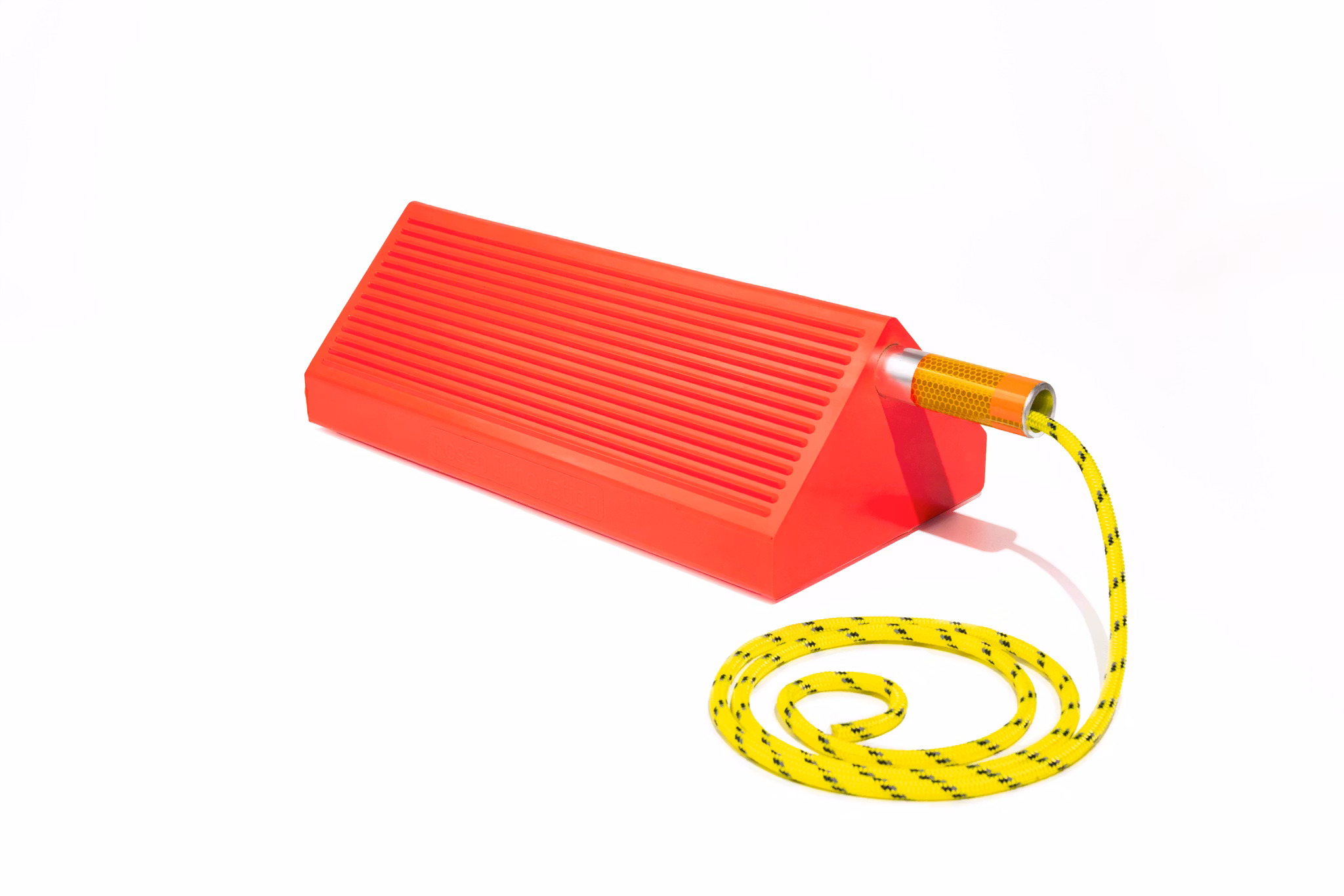 The "Mark 36 Chock" is designed for large aircraft, e.g. Boeing 737 or Airbus A320, and aviation equipment. The product is made of very durable, lightweight, polyurethane. The material is resistant to extreme weather conditions, oils, propellants, as well as a high tear and abrasion resistance. Thanks to the material properties, the chock will never rot, crack or splint. Tests have shown that Mark 36 Aircraft Chock takes more wheel force than conventional rubber chock. Mark 36 Chock has an innovative aluminium handle, which generates a lever and thus an increased user-friendliness. A reflex is placed on the outermost part of the handle in order to further visualize the chock if it would be placed behind a wheel. Thanks to the shape of the chock in combination with the handle, it is easy to place at the right place. The material is 100% recyclable.
