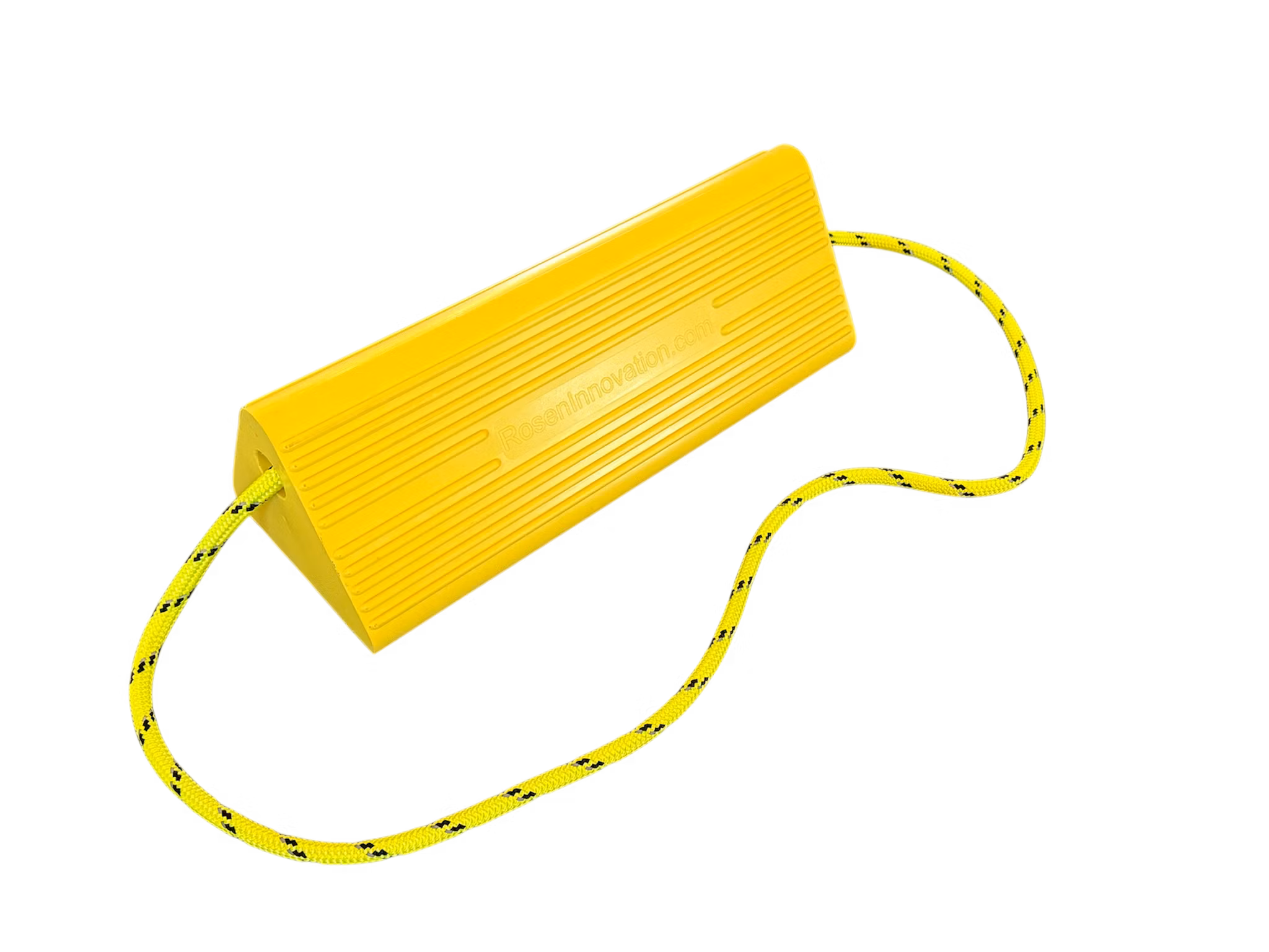 Mark 42 Chock has an innovative aluminium handle, which generates a lever and thus an increased user-friendliness. To increase the product's user-friendliness even further a rope runs through the aluminium handle. A reflex is placed on the outermost part of the handle in order to further visualize the chock if it would be placed behind a wheel. Thanks to the shape of the chock in combination with the handle, it is easy to place at the right place. The material is 100% recyclable.