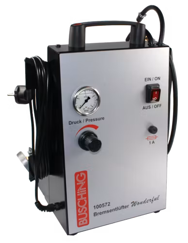 The brake bleeder is specially designed for workshop use and works directly from original containers with up to 10 liters. The high-quality, powder-coated aluminum housing makes brake bleeding feather-light in handling at only 3.7 kg. The system is suitable for normal and ABS brake systems. Since the fluid is taken directly from the container with a hydraulic pump, the work is environmentally friendly and clean. Foaming of the fluid is also prevented and there is no pressure build-up when the container is empty. The pressure is automatically released after the device is switched off, which means that the adapter can be easily removed from the vehicle expansion tank. The brake bleeder can be operated by one person. Likewise, a low-pressure test can be performed on the vehicle. Due to the optimized flow rate, the gas, air, as well as corrosion components are flushed out. A holding device for the adapters and rubber cones is available. The high quality WIKA pressure gauge with stainless steel housing and glycerine filling allows highest reading accuracy and a precision pressure regulator enables easy and accurate regulation of the filling pressure. Due to the patented MaBu design, the system is extensively expandable.