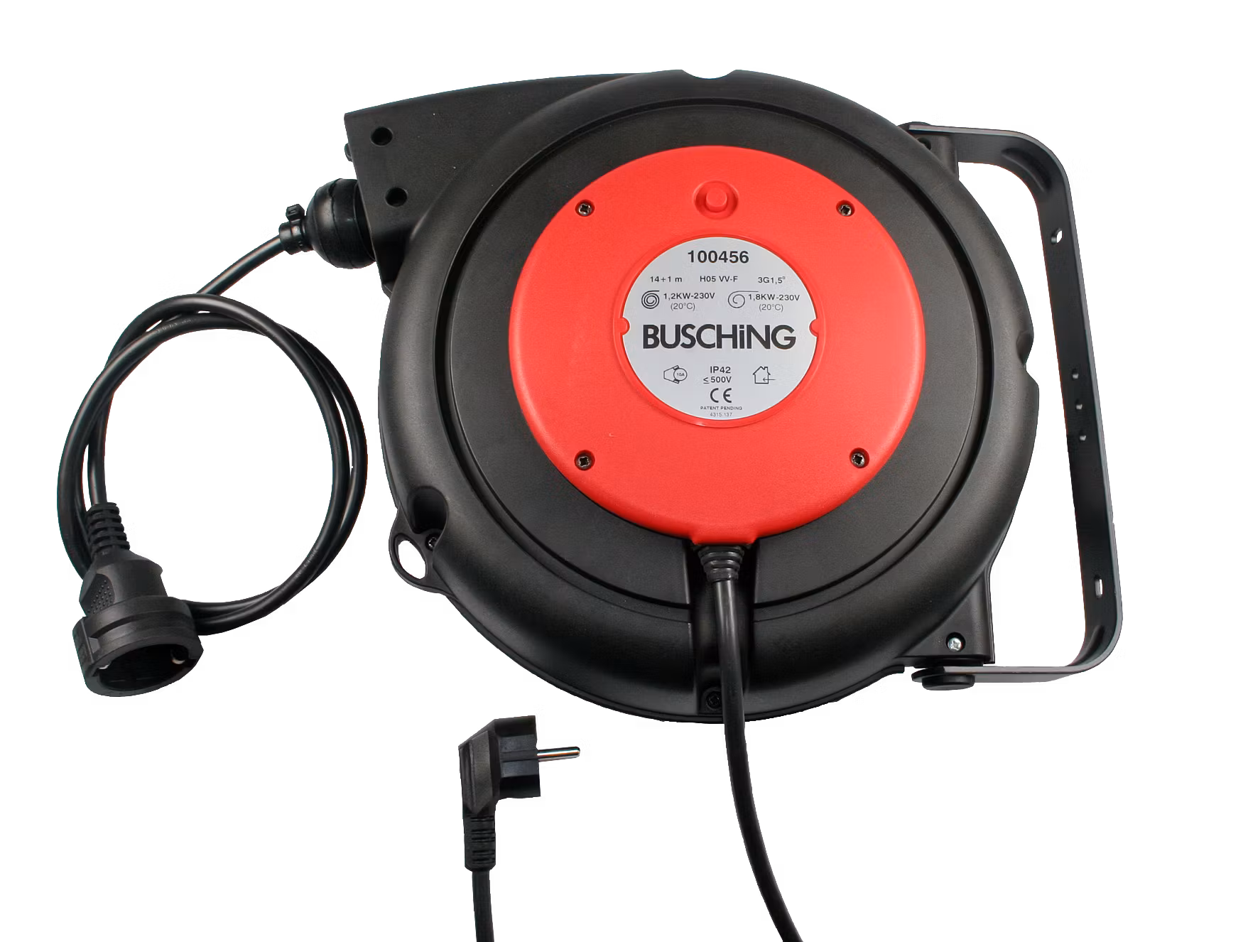 The cable reel is made of impact-resistant plastic with spring drive and swivelling wall bracket. The lock that can be switched off allows you to choose between a continuous pull or a ratchet (every 50 cm). The unit is also protected against overload.