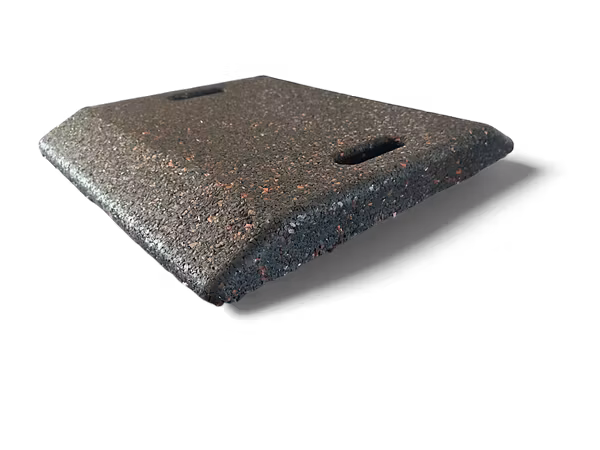 Polyurethane granulate ramp with dimensions 500 x 500 x 40 mm. It has a slope on two sides so that vehicles can safely drive on and off the ramp. Two handles in the ramp to make it easier to handle.