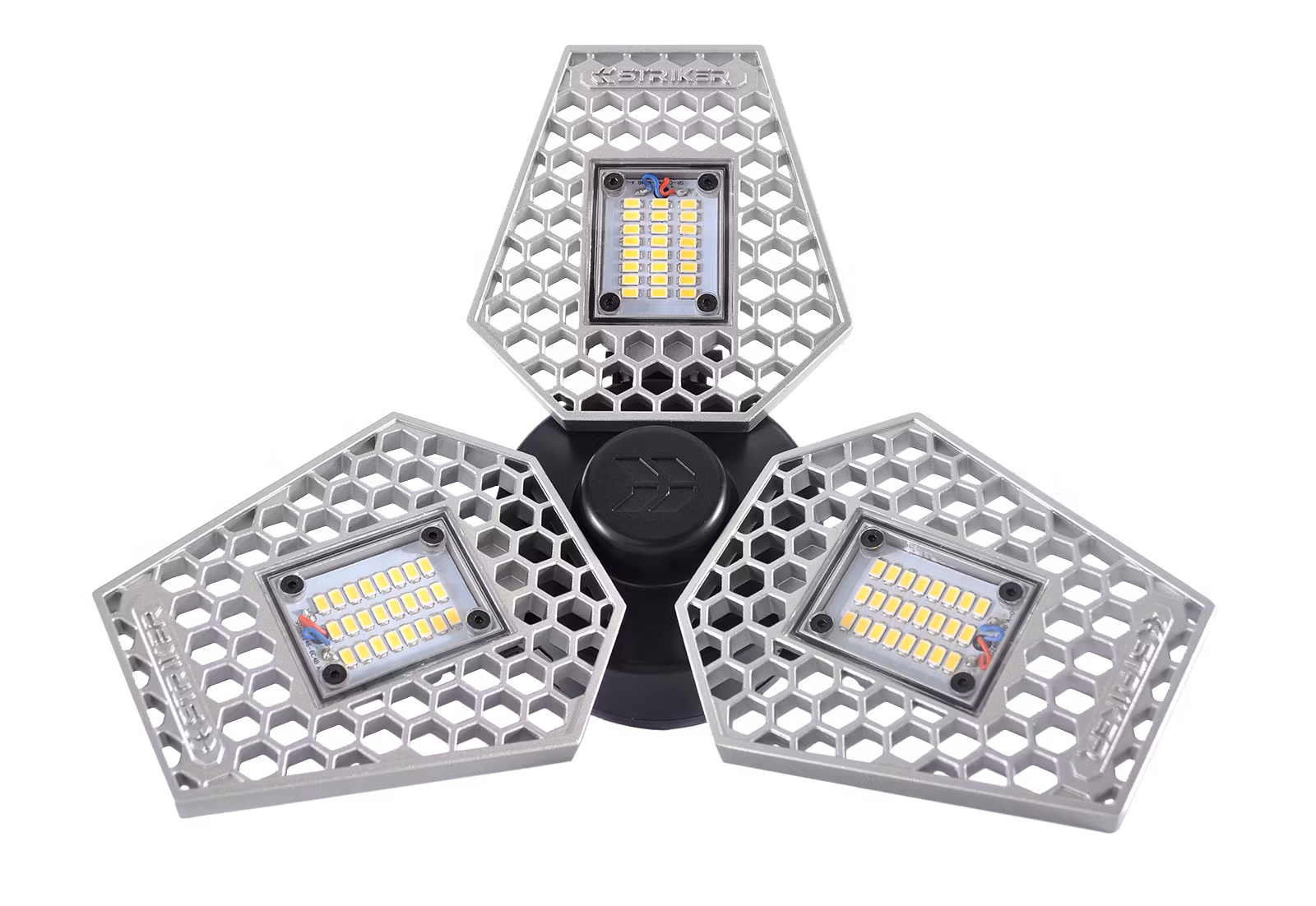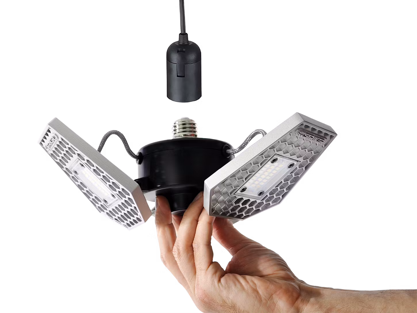 No more dark rooms and garages badly lit by incandescent lamps - simply replace the bulb (E27 socket) with the ceiling light "3LiGHT". A highly sensitive 360 ° motion sensor enables the smallest detection even in the darkest environment. When the motion sensor is activated, the ceiling light automatically turns off after 90 seconds when there is no movement. Powerful 3,000 lumens LEDs at just 24 watts keep the room bright, and electricity costs low. The lamp is not only environmentally friendly, but also produces 3.8 times more illumination compared to a conventional incandescent lamp. The robust aluminum heads are functional heatsinks as well as works of art. They are mounted on the main body with a friction pivot so that the light can be tilted at 90 ° and pointed to where it is needed. The braided steel cables ensure longevity and style. The ceiling light is not dimmable.
