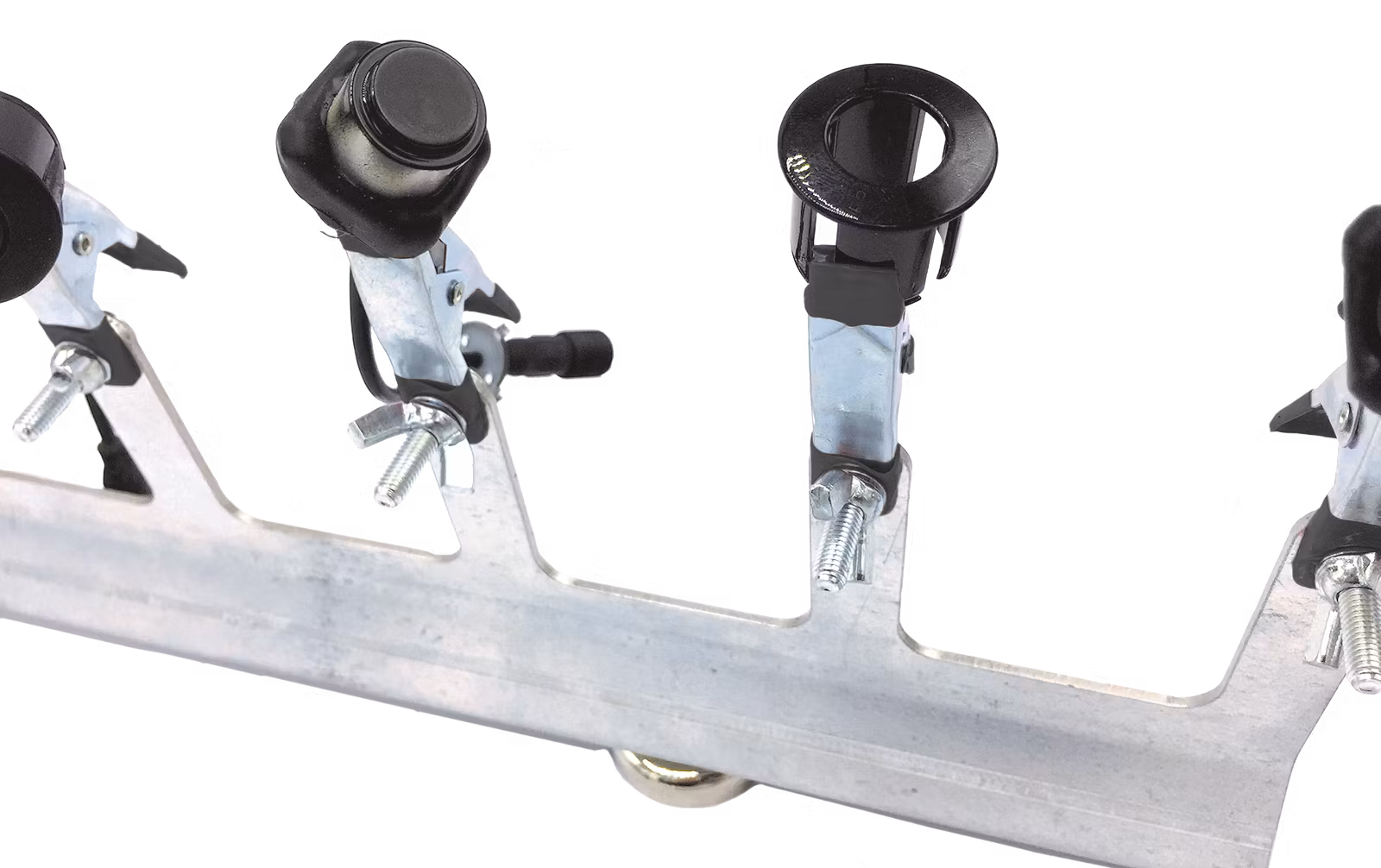 Assembly rail with ten pliers for drying the painted parking assistance sensory. With two neodymium flat-grip magnet on the assembly rail perfectly sticks on all magnetic materials like steel perforated wall, the painting booth or the varnishing rack. The ten pliers ensure fast working when painting parking assistance sensors or other small parts.